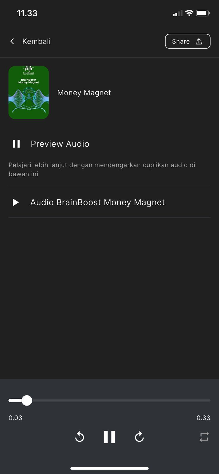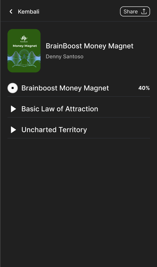 Setelah kamu melakukan pembelian melalui Link atau mencarinya langsung via Tribeversity. kamu dapat akses BrainBoost yang sudah kamu beli di aplikasi. Akses konten melalui Aplikasi memberikan pengalaman yang lebih dengan fitur pemutaran di *background.* Kamu bisa memutar audio dengan posisi handphone terkunci, dan juga tidak akan terganggu dengan koneksi internet, karena kamu sudah melalukan unduh audio tersebut terlebih dahulu.