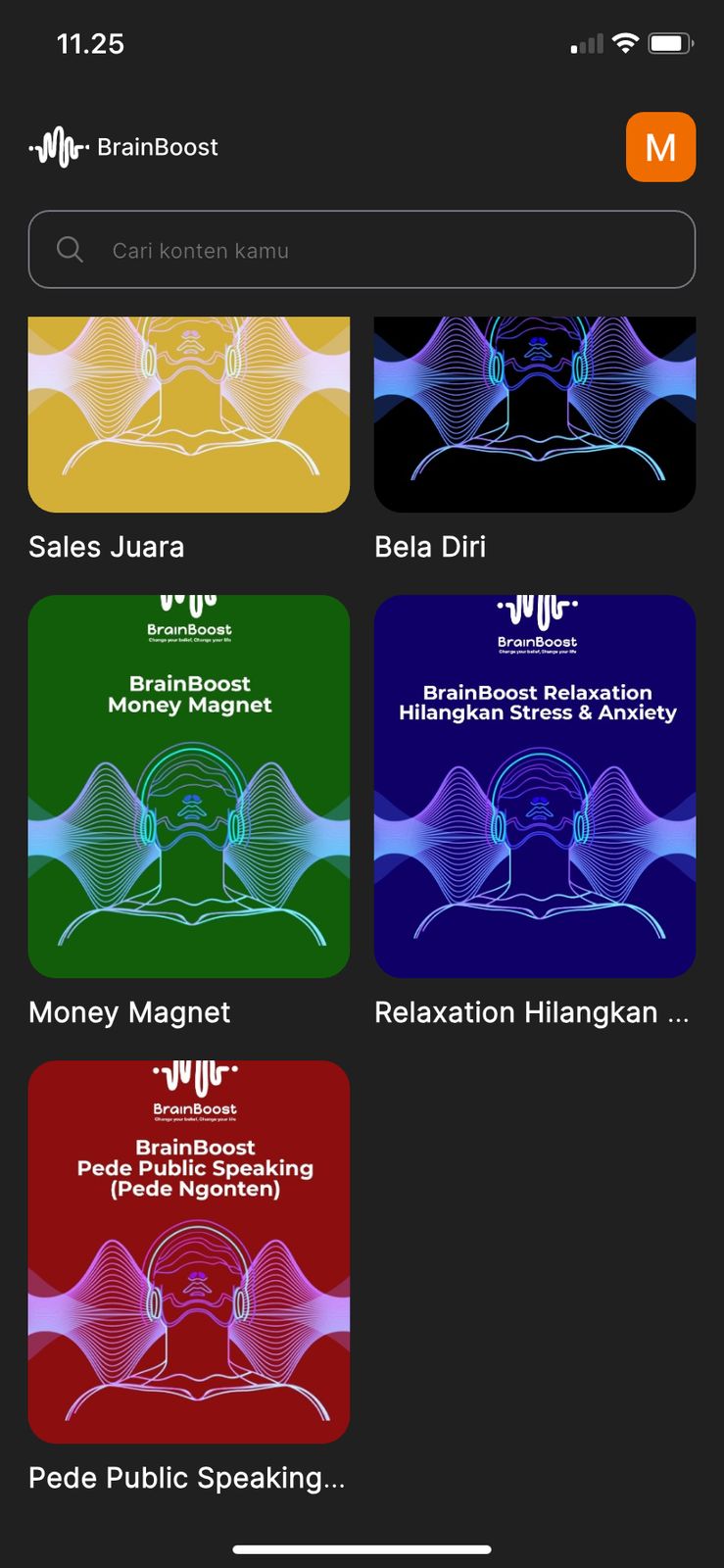 Setelah melakukan pendaftaran atau masuk ke Aplikasi, kamu akan diarahkan ke produk-produk brainboost yang sudah kamu beli sebelumnya. Pada *platform* iOS (Iphone) kamu tidak dapat membeli produk BrainBooost dari aplikasi. Aplikasi BrainBoost hanya sebagai akses untuk menikmati konten-konten yang sudah kamu beli melalui platform Tribeversity atau link. kamu dapat memilih produk yang ingin kamu akses, dan klik produk tersebut. untuk akses konten BrainBoost  kamu dapat mengikuti langkah-langkahnya seperti berikut